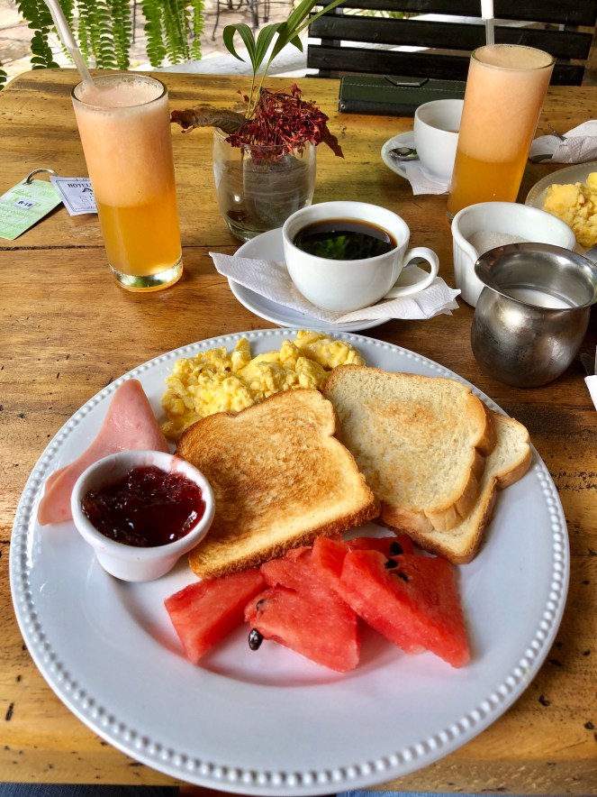 Tag 10: Heute steht der Tag ganz im Zeichen der Maya’s! Copán war eine sehr bedeutende Stadt während der klassischen Maya-Periode (etwa 250 bis 900 n. Chr.). Im 8. Jahrhundert erlebte sie mit etwa 30.000 Bewohnern im Copán-Tal ihre Blütezeit, wurde bald darauf jedoch ebenso verlassen und verfiel, wie die meisten anderen Maya-Städte auf der Halbinsel Yucatán. Die Ruinenstätte wird seit Mitte des 19. Jahrhunderts unermüdlich erforscht und gehört seit 1980 zum UNESCO-Weltkulturerbe. Bevor wir uns auf den Weg machten, frühstückten wir allerdings erstmal. Allein! Und nicht besonders üppig. Von anderen Gästen war weit und breit keine Spur.
