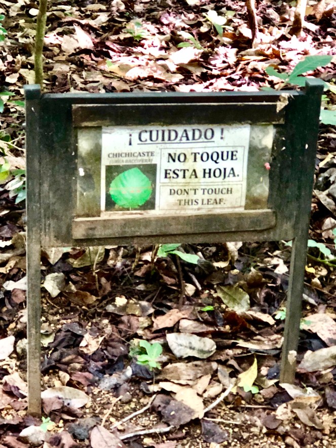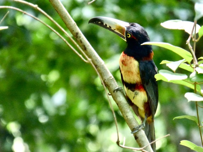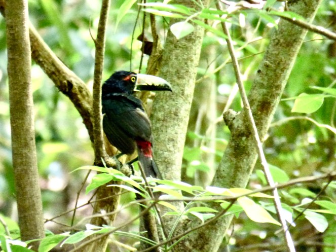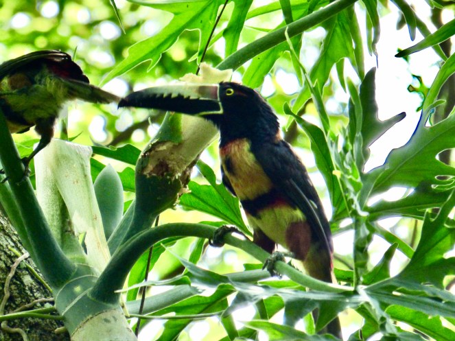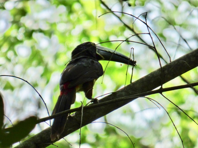 Am Ende des Stelenfeldes wies dieses Hinweisschild zu einem kleinen Sendero von 600 m zu einer weiteren Ruinen-Gruppe. Da ich annahm, dass Christiane noch eine ganze Weile benötigen würde, ging ich also noch etwas wandern. Eine hervorragende Entscheidung, denn ich sah so noch allerlei Tiere, die meine Kameralinse zum Glühen brachten. Allen voran unzählige Halsband-Arassaris aus der Familie der Tukane. Wunderschöne Vögel! Es schien fast so, als würden sie mich auf dem Pfad begleiten.