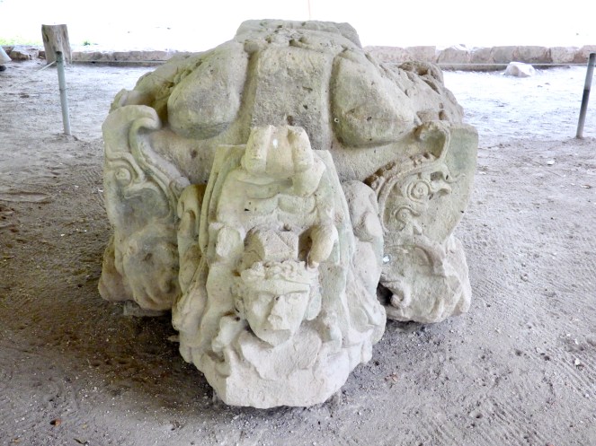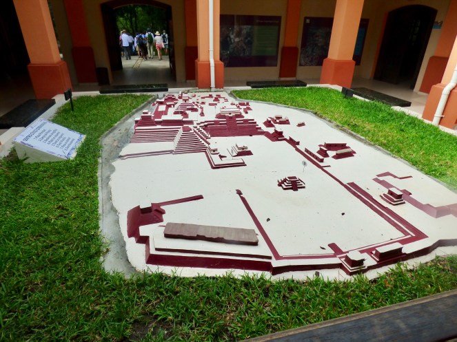 Wir liefen vom Hotel aus in die Richtung, in der sich die Ruinen befinden mussten und es dauerte nicht lange, bis uns ein Tuk Tuk aufgabelte. Es war gut, dass wir uns dafür entschieden, denn wie wir später feststellen mussten, wären wir nach der nächsten Gabelung wohl falsch abgebogen. Auf dem relativ leeren Parkplatz angekommen, verschafften wir uns zunächst einen Überblick auf dem Miniaturgebilde im Foyer und lösten dann die Tickets. Wir schlenderten dann hinter einer kleinen Reisegruppe mit englischsprachigem Guide durch das angeschlossene kleine Museum und lernten so ein wenig über die Mayas, Honduras und die Ausgrabungsstätte.