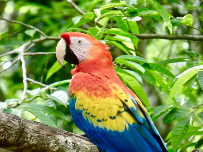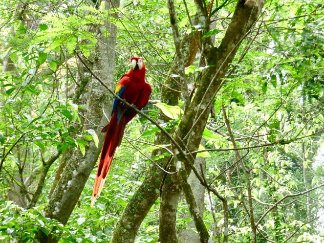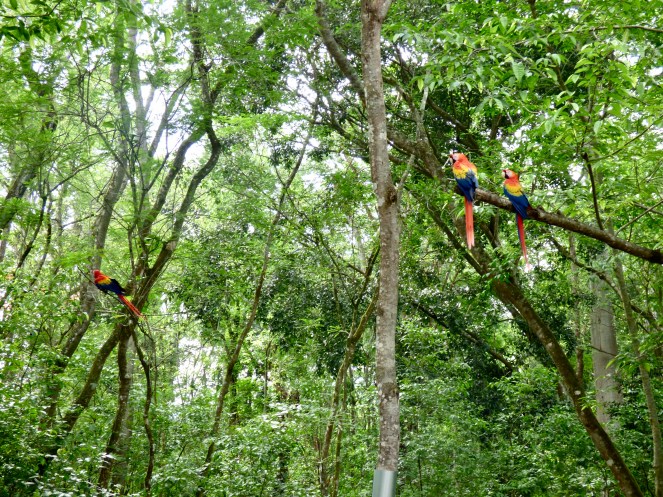 Wir spazierten gemütlich durch die Anlage, deren Weg bis hinunter ans Flussufer führte und auf der anderen Seite wieder hinauf bis zu einem netten Café mitten im Dschungel. Auch hier tummelten sich frei lebende Halsband-Arassaris.