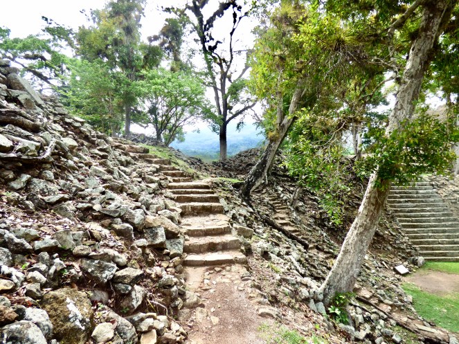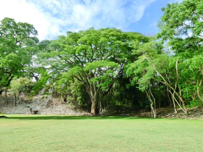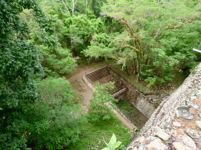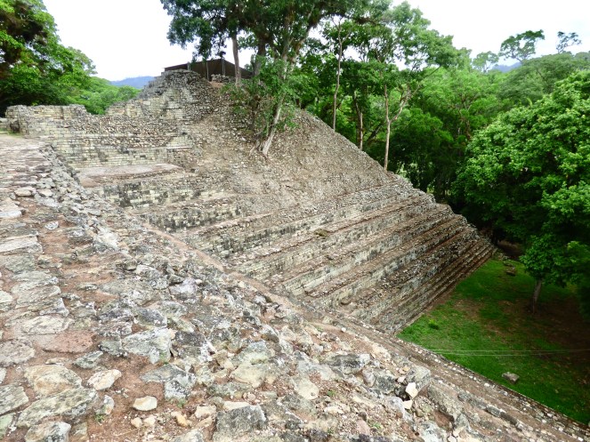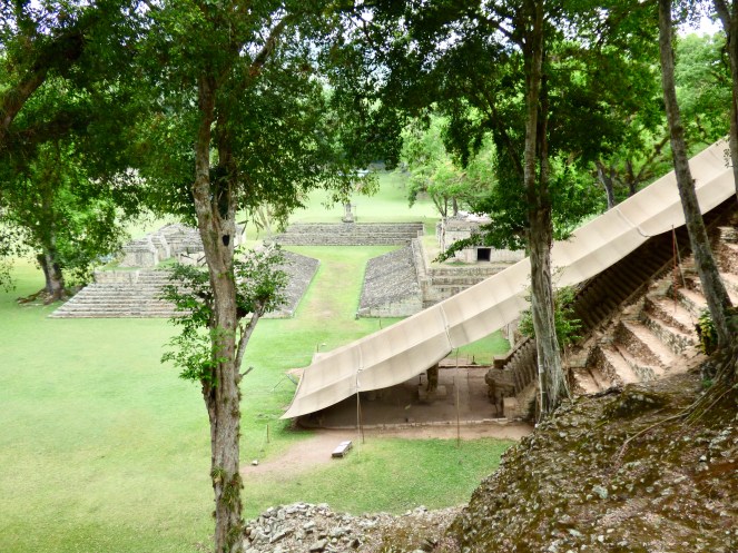Die Ausblicke von der Akropolis, insbesondere dem größten Tempel 22, auf den saftig grünen Dschungel waren überragend! Unweit entfernt konnte man das Rauschen des Rio Copán vernehmen. Hier der Ausblick auf den Osthof in Richtung Süden.