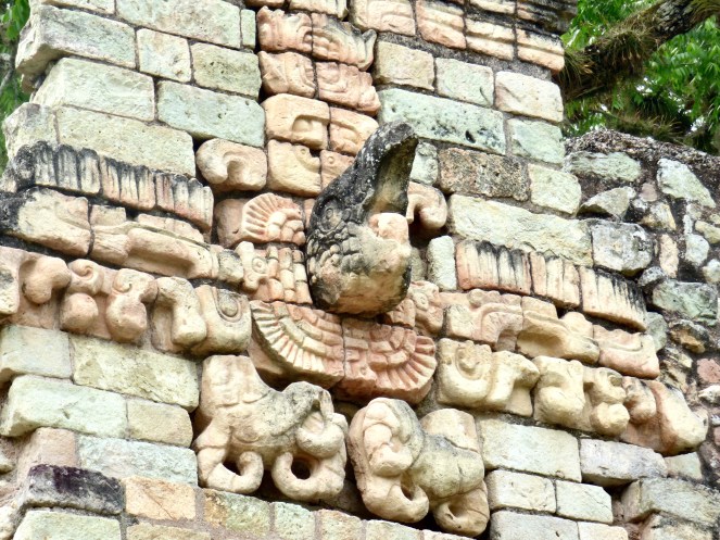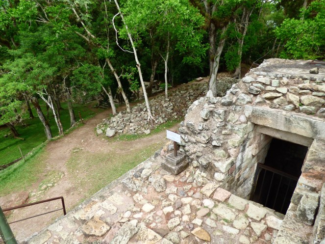 An der Ostseite der Akropolis entlang bohrte ich mich tiefer in den Dschungel hinein. Die ursprüngliche Ostseite des Komplexes existiert heute nicht mehr, da sie im Laufe der Jahrhunderte vom Rio Copán unterspült und abgetragen wurde. Daher geht es hinter dem Drahtzaun auch ziemlich steil bergab. Da die Maya’s in ihren verschiedenen Epochen immer wieder neue Tempel bauten entstanden mehrere Lagen. Die Maya’s nutzten die bereits vorhandenen Tempel, um ihren eigenen Stil darauf zu verewigen und bauten einfach über das alte Gemäuer neue Tempel. Hier hinten führen mehrere Eingänge in das Innere der älteren Anlagen. Der Eintritt ist extra zu zahlen oder ist in einer Tour mit Guide inkludiert. Christiane berichtete mir später, dass die Höhlen zwar interessant, aber sehr dunkel und nur wenig spektakulär waren.