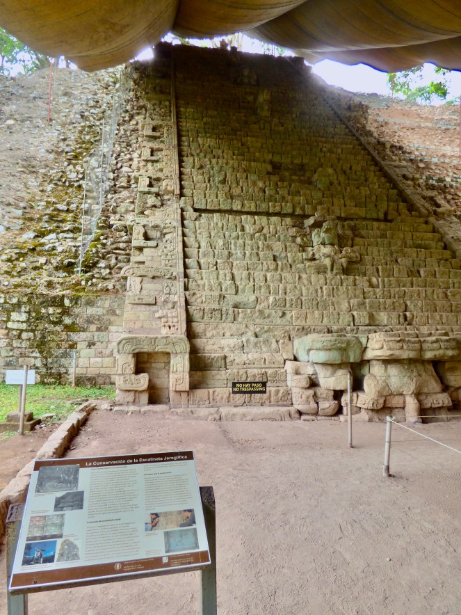 Die Masken der Maya-Könige, hier an der Jaguar-Treppe im Osthof, waren alle überdacht, um sie vor Witterungsschäden zu schützen.