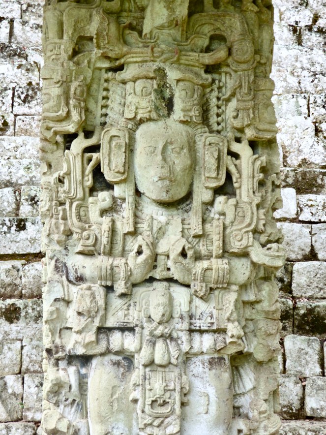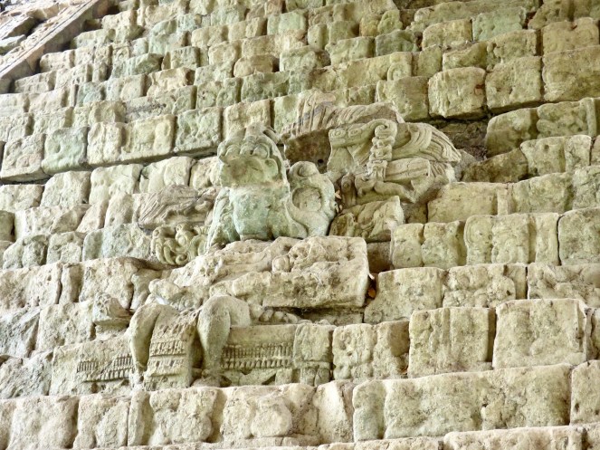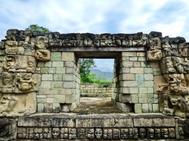 Der Eingang zum Tempel 22, den der Maya-König „18 Rabbits“ (ja, der hieß wirklich so!) um 715 n. Chr. erbauen ließ, um seine bis dato 20-jährige Macht zu krönen. Die Pauahtun-Kolosse, oder auch Bakabs genannt, rechts und links des Eingangs halten das Himmelsband. Die Schädel der unteren Stufe symbolisieren die Unterwelt.