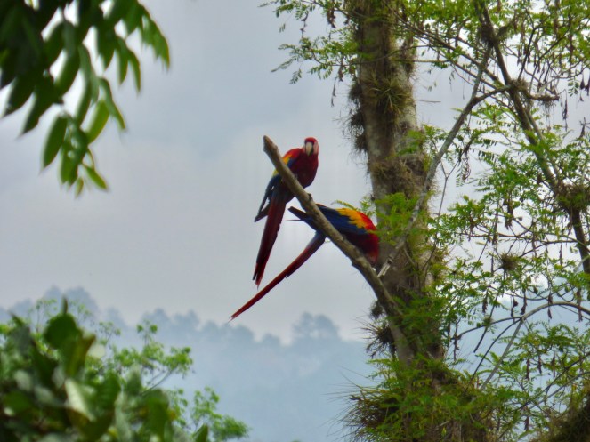Es stellte sich heraus, dass die Ara’s dort regelmäßig gefüttert werden, damit sie die Feldfrüchte der umliegenden Bauern in Ruhe lassen. Mittlerweile hat es sich bei den Ara’s wohl herumgesprochen und so wimmelt es in Copán Ruinas nur so von Roten Ara’s. Der Geräuschpegel dieser riesigen Raubvogelscharen ist enorm, aber auch sehr faszinierend. Ich jedenfalls könnte ihnen stundenlang lauschen und zusehen wie sie laut schimpfend im Tiefflug über die Ruinen hinwegschweben.