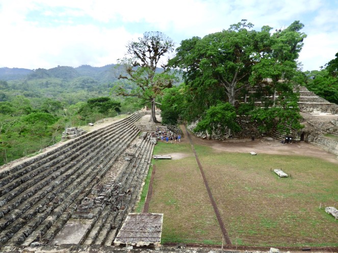 Aber nun auf zur wahren Sehenswürdigkeit, den Ruinen. Hier der sehr gut erhaltene Ballspielplatz, der zweitgrößte, der je im Gebiet der Maya entdeckt wurde, und direkt dahinter die berühmte Hieroglyphen-Treppe.