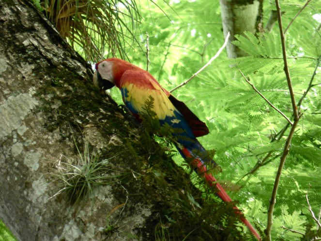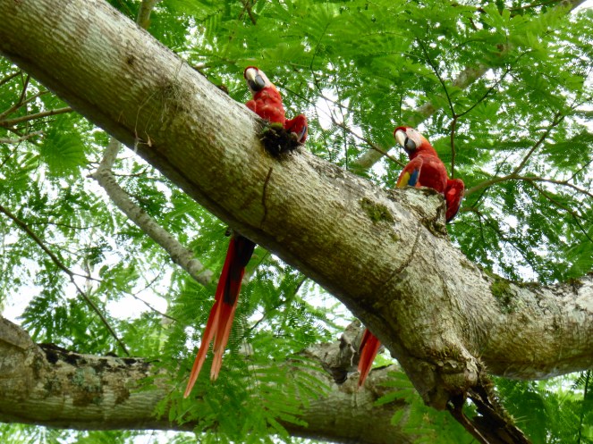 Noch auf dem Weg zur Anlage trennten sich dann unsere Wege. Ein Guide, der zwei Mädchen (ich meine, es waren eine Südamerikanerin und eine Holländerin) durch die Anlage führen wollte, erinnerte sich daran, dass Christiane am Schalter nach einer geführten Tour gefragt hatte. Alleine war es ihr zu teuer gewesen, aber zu Dritt sank der Preis und er rannte hinter uns her, um sie erfolgreich abzuwerben. So zog ich also alleine weiter und beobachtete erstmal eine ganze Weile meine wunderschönen Lieblings-Aras, die sich am Eingang der Ruinen tummelten. Das ganze Areal muss laut Tafel ein Paradies für Birdwatcher sein.