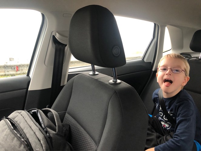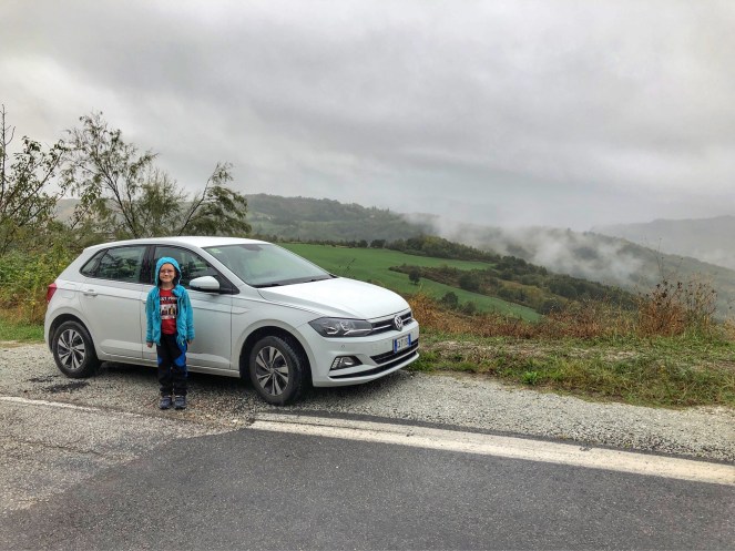 Wir holten unsere Koffer und ich tröstete Mika, der sehr enttäuscht darüber war, dass wir über keinerlei Laufbänder, sogenannte Fahrsteige, laufen konnten. Seit Toronto liebt er die wie verrückt. Wir folgten den Schildern „Rent a car“ bis zum nächstgelegenen Parkhaus. Die Abholung verlief reibungslos und relativ zügig. Der Plan sah ja ursprünglich vor, ganz gemütlich an der Küste entlang bis nach San Marino zu tingeln und da anzuhalten, wo es schön ist. Durch die Verschiebung des Fluges von 9:15 auf 13:10 Uhr kamen wir aber erst gegen 15 Uhr an und konnten somit erst gegen 16:20 Uhr vom Flughafen losfahren. Auch das Wetter spielte leider so gar nicht mit. Es regnete, regnete, regnete.