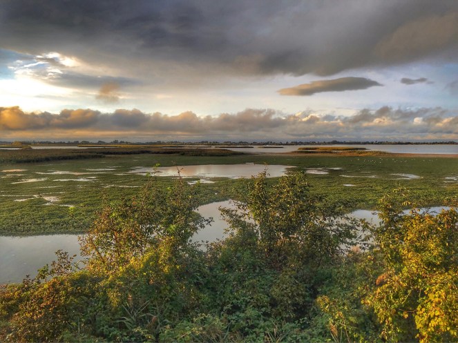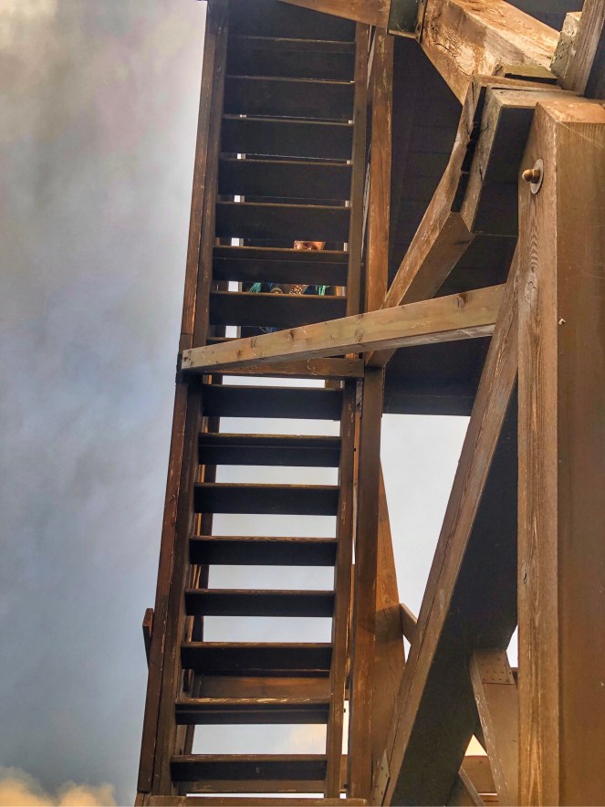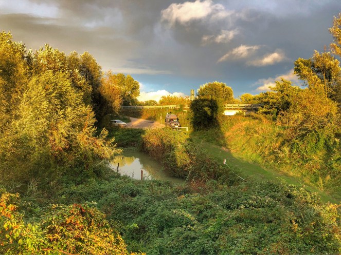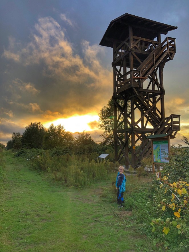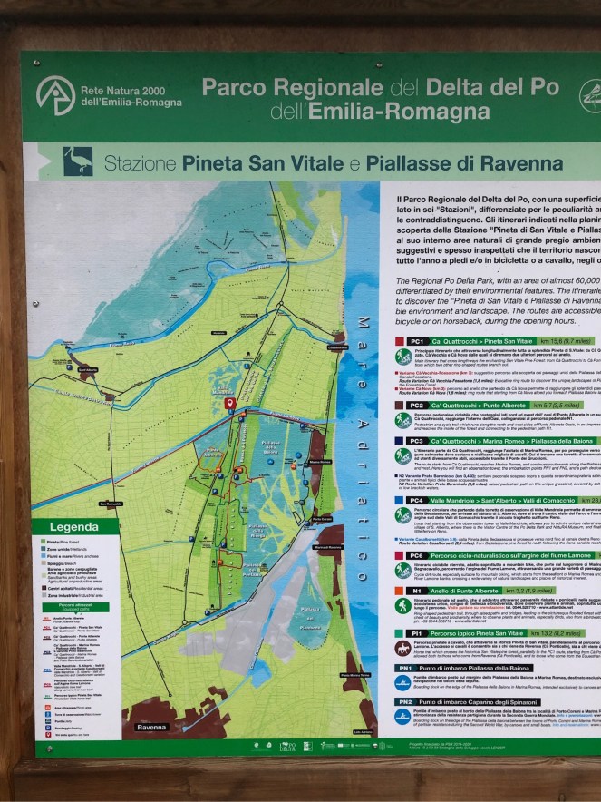 Kurz vor Chioggia fuhren wir über einen ewig langen Damm (Bild oben), zu dessen beiden Seiten die Wellen auf die Straße peitschten. Endlich am Meer! Bei sonnigem Wetter wäre die Fahrt sicher nicht zum Aushalten schön gewesen. Kurz hinter der Abfahrt nach Chioggia durchquerten wir einen Nationalpark. Der Himmel klarte kurz auf und wir hielten an einem Aussichtsturm, den wir erklimmen wollten. Ich schaffte es dank meiner Höhenangst nur bis auf die erste Plattform, haha. Mika kraxelte natürlich bis ganz nach oben und feixte.