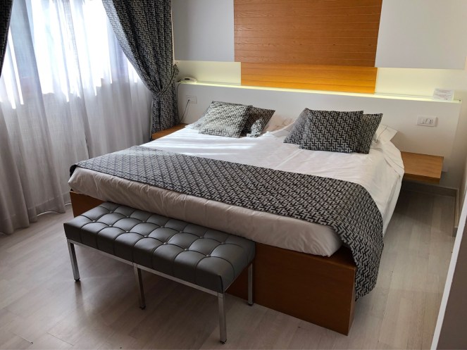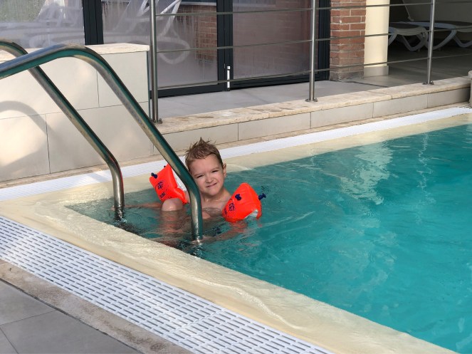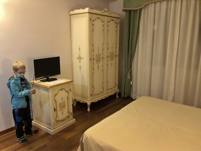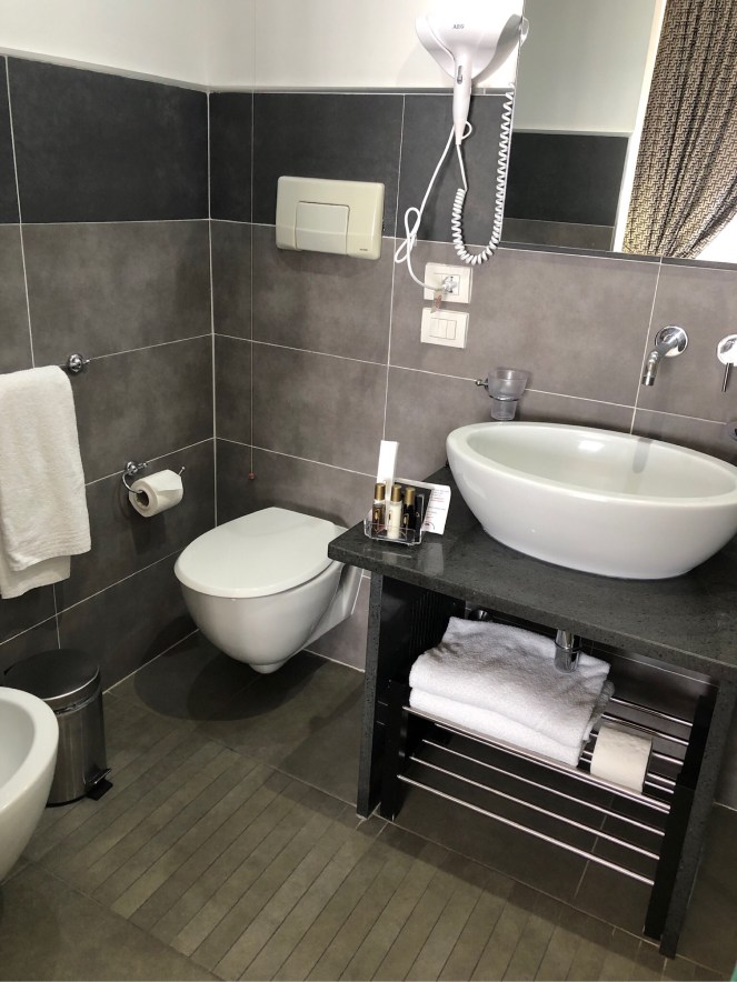 Unser Hotel, das Grand Hotel Primavera, war mit Google Maps leicht zu finden und befindet sich bereits am Berghang in San Marino, jedoch noch vor dem Grenzschild zum historischen Zentrum. Das Zimmer war sehr sauber und landestypisch eingerichtet. Den Indoor-Pool fanden wir direkt am Ende unseres Flures. Wir ruhten uns 10 Minuten aus und gingen dann noch fix schwimmen, bevor wir in die Betten fielen.