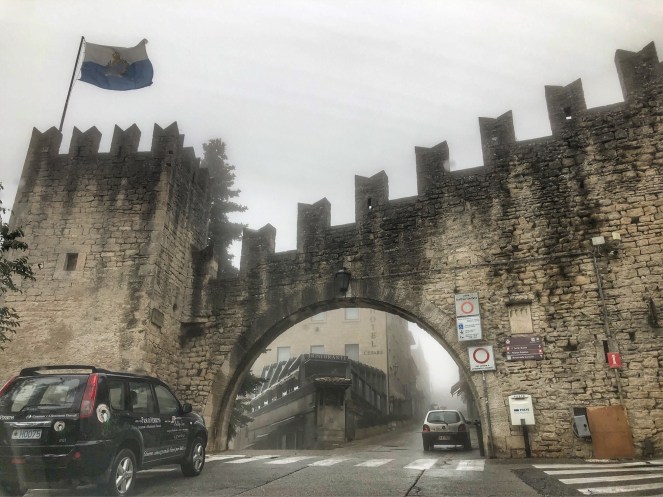 Mit dem Wetter hatten wir wirklich großes Pech! Ganz oben angekommen hielten wir auf dem Parcheggio 6, direkt neben einem Stadt-Tor. Die riesige Stadtmauer war schon sehr beeindruckend und ich überlegte kurz, ob wir auf einen freien Parkplatz warten und einen Spaziergang durch die Altstadt wagen sollten. Aber es begann zu regnen – nach und nach immer stärker – und ein Parkplatz wurde auch nach 10 Minuten immer noch nicht frei. Da das Spektakulärste in San Marino, meiner bescheidenen Meinung nach, wohl die Sicht nach unten ist und diese Sicht heute gleich Null war, verabschiedeten wir uns von dem Gedanken, zu Fuß den Berggipfel zu erkunden. Wir hatten auch weder Schirm noch Regenjacke dabei.