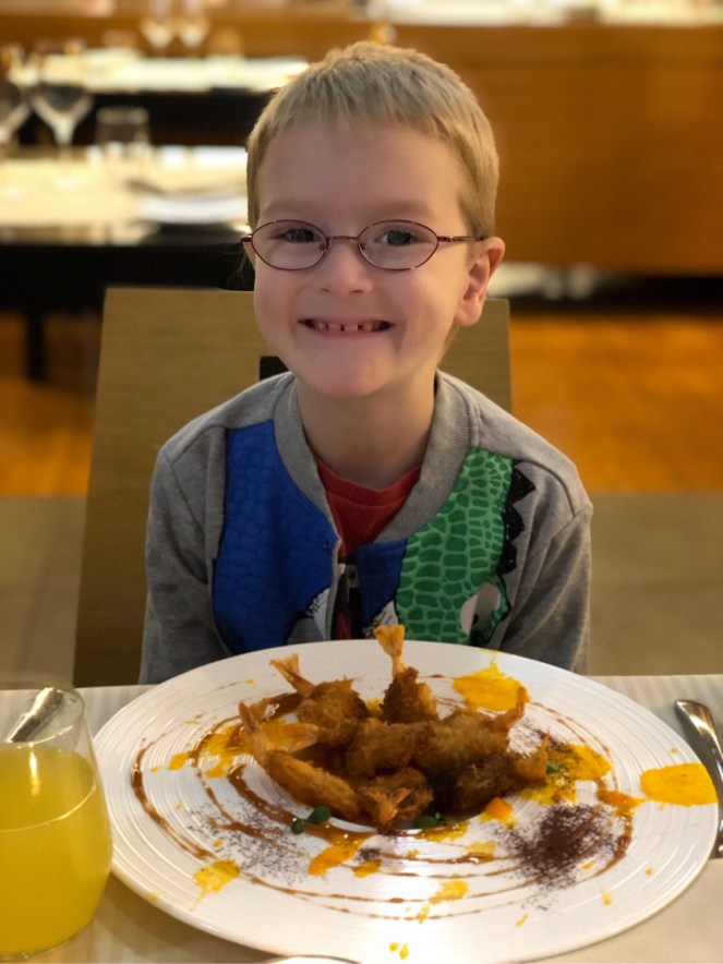 Punkt 19:30 Uhr betraten wir das hoteleigene gemütliche Restaurant, dass wir uns lediglich mit zwei holländischen Mädels und einer kleinen dreiköpfigen italienischen Familie teilten. Das Essen war sehr lecker – für mich gab es Risotto und für meinen kleinen Gourmet die ersten Shrimps in diesem Urlaub.