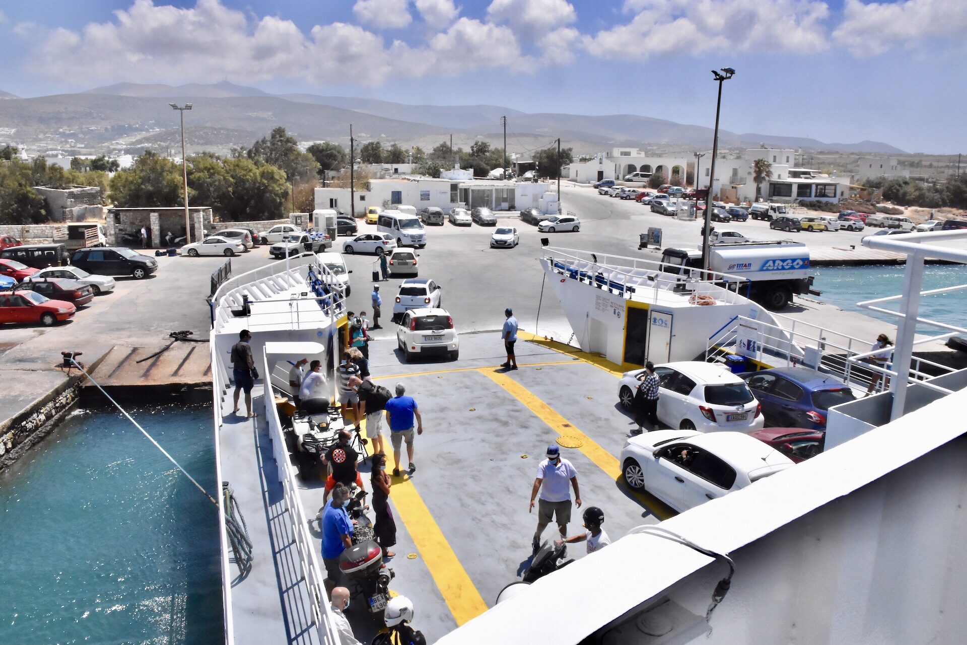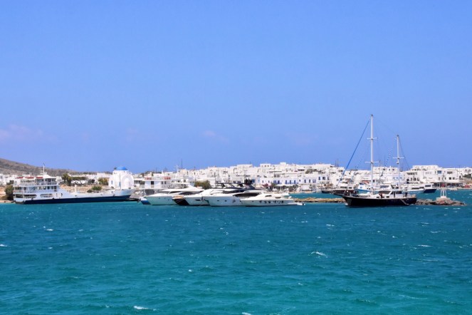 Innerhalb von 15 Minuten waren wir am anderen Ufer in Antiparos. Die Fahrt kostete uns inkl. Auto 7,80 €. Kinder fahren kostenlos. Bei der Einfahrt in den kleinen Hafen war anhand der „Boote“ schon direkt klar, dass hier keine armen Menschen leben. Und in der Tat ist Antiparos bei den Reichen und Schönen für einen Zweitwohnsitz wohl sehr beliebt. Um nur einige zu nennen: Sean Connery, Madonna, Harrison Ford, Whoopi Goldberg und – wie der Titel dieses Beitrags schon verrät – Tom Hanks sind regelmäßige Besucher dieser kleinen Insel. Von Letzterem stammt die Ehefrau von Antiparos, weshalb sie jedes Jahr ihre Ferien hier verbringen. Mit etwas Glück trifft man olle Tom abends bei einem Glas Wein in einer Taverne an.