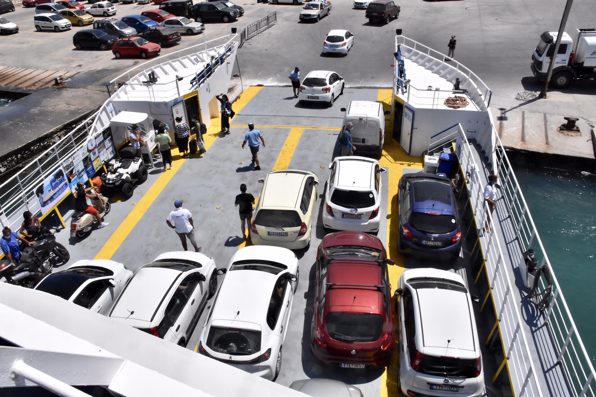 Tag 12: Heute sind wir gegen 11 Uhr zum Hafen aufgebrochen und just in dem Moment legte auch schon die Fähre an. Wir reihten uns in die kurze Schlange ein und beobachteten, wie alle Autos kurz vor der Rampe drehten und rückwärts auf’s Schiff fuhren. Das ist immer das, was ich am meisten „liebe“: auf der Autofähre eingewiesen werden. Wir sind übrigens der kleine Weiße rechts neben dem roten PKW, der sich so schön an uns geschmiegt hat. Auf dem Oberdeck war so gut wie niemand, denn der Wind pfiff uns heute ordentlich um die Ohren. So kam es dann auch, dass ich innerhalb von Sekunden Wasserspritzer auf und ständig Haare vor der Linse hatte und das Fotografieren in Anstrengung ausartete.
