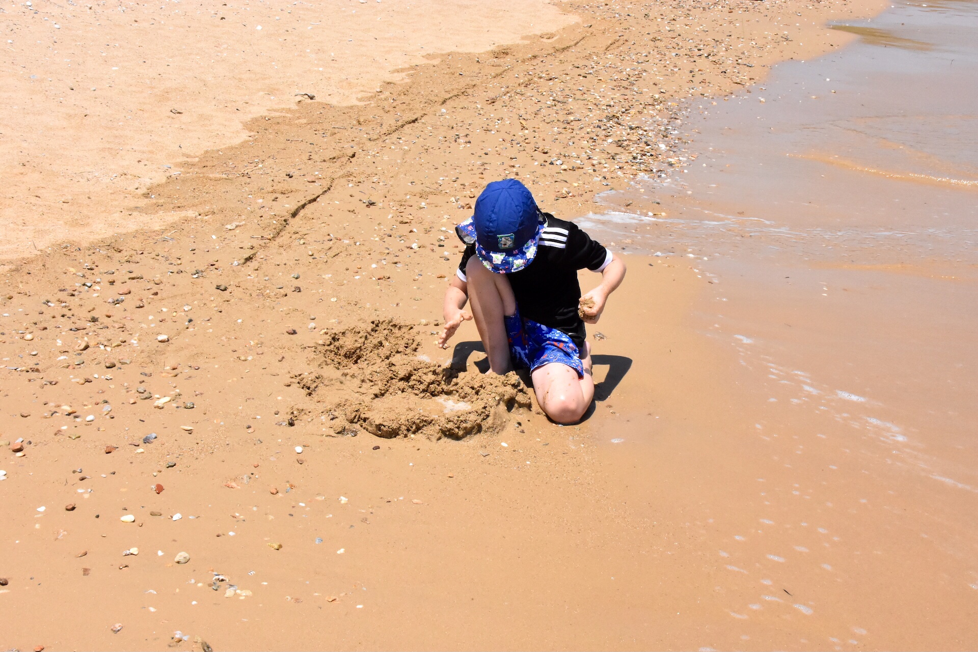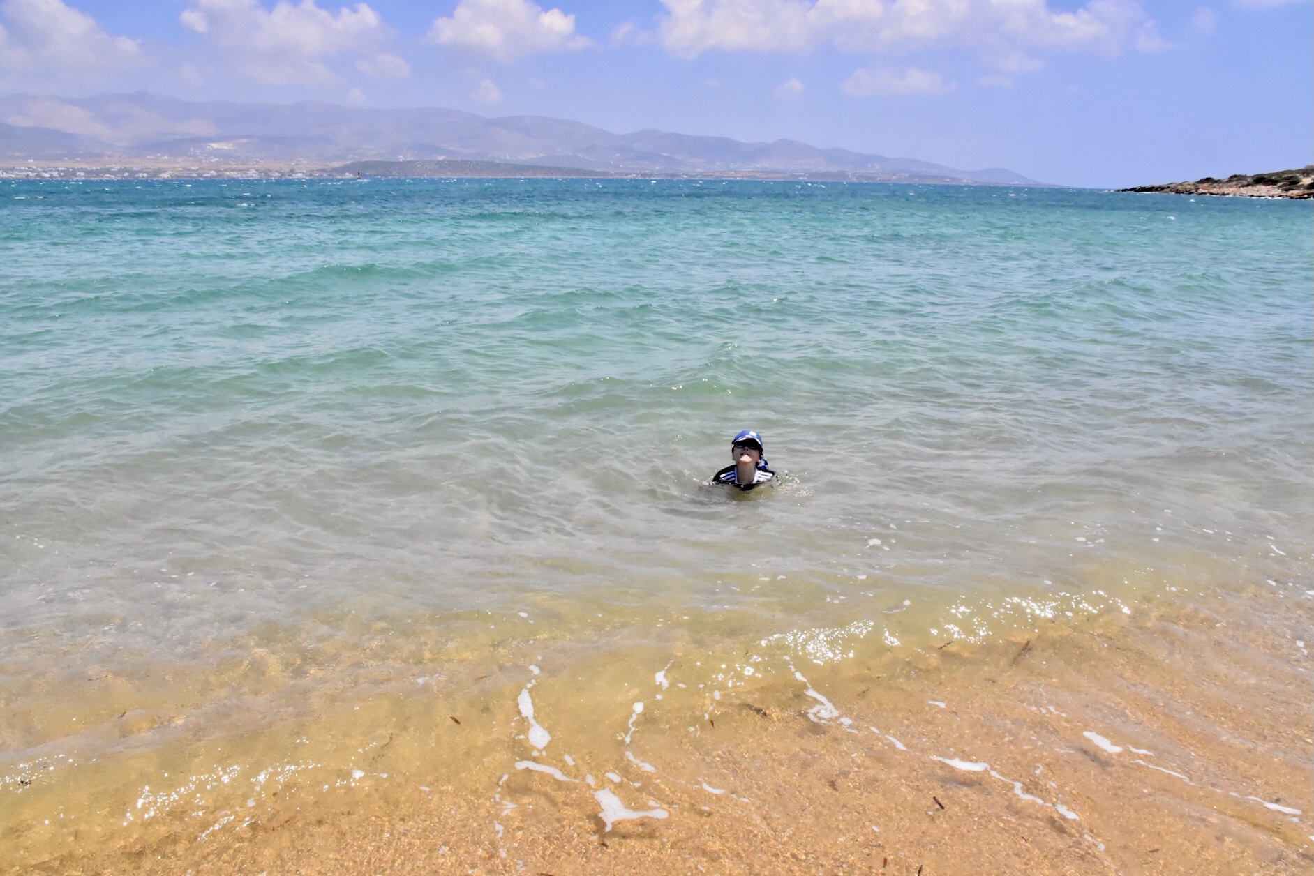 Antiparos ist touristisch weit weniger erschlossen als Paros, ursprünglicher und durchdrungen von einer leichten Hippie-Atmosphäre. Es gibt neben dem Hauptdörfchen und den Stränden nur eine Hauptsehenswürdigkeit auf der Insel und das ist eine Grotte etwas im Landesinneren. Zunächst führte uns aber die einzige Straße an der Ostküste entlang Richtung Süden. Weit kamen wir nicht, denn wir wurden sofort von einem schönen breiten Sandstrand angezogen. Die Sonne knallte wieder so heftig, dass ich Mika nur mit Shirt und Mütze ins Wasser ließ. Der Strand war wirklich schön und das Wasser badewannenwarm. Wir sammelten bestimmt eine Stunde lang bunte Steine, um dann den schönsten als Erinnerung mitzunehmen.