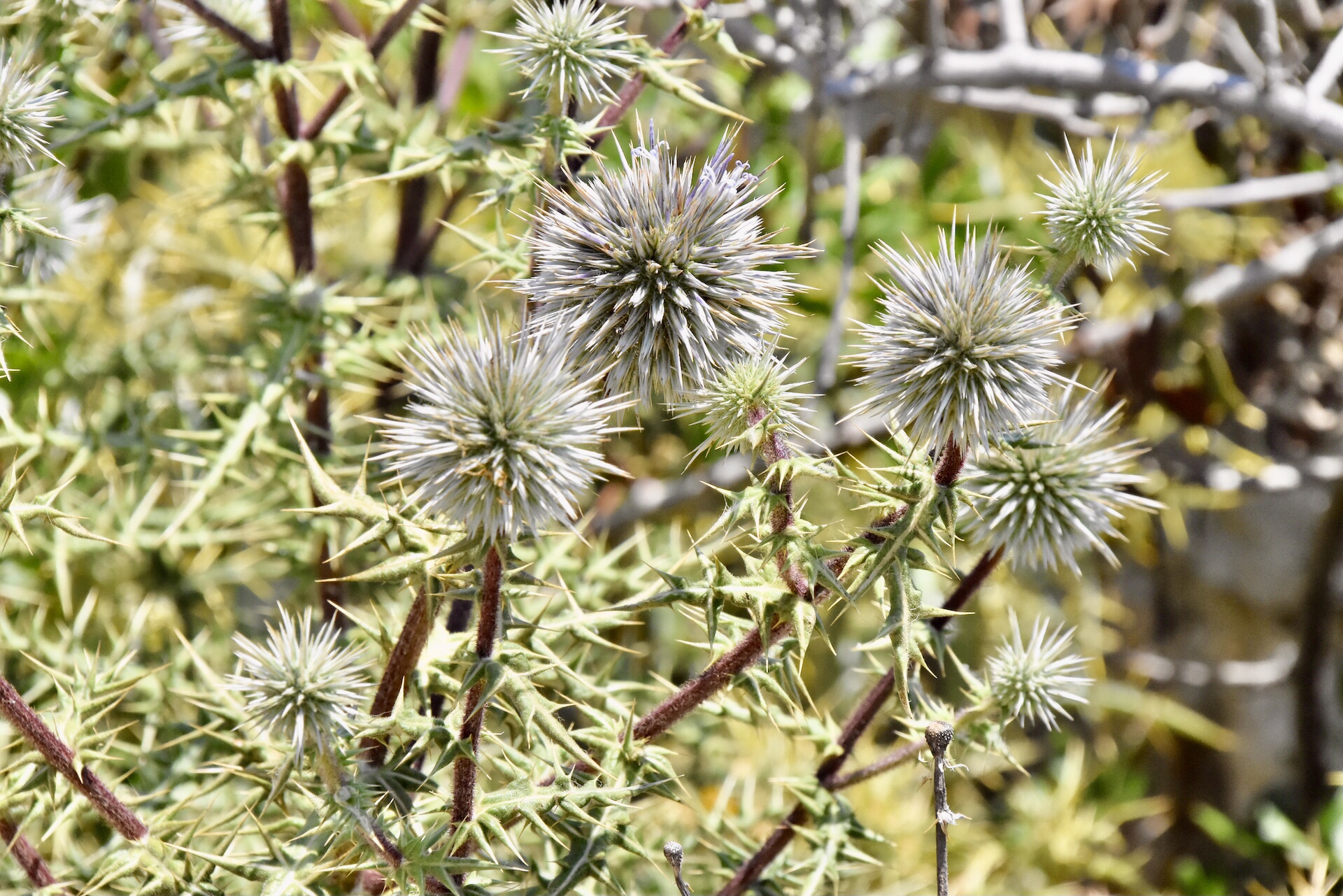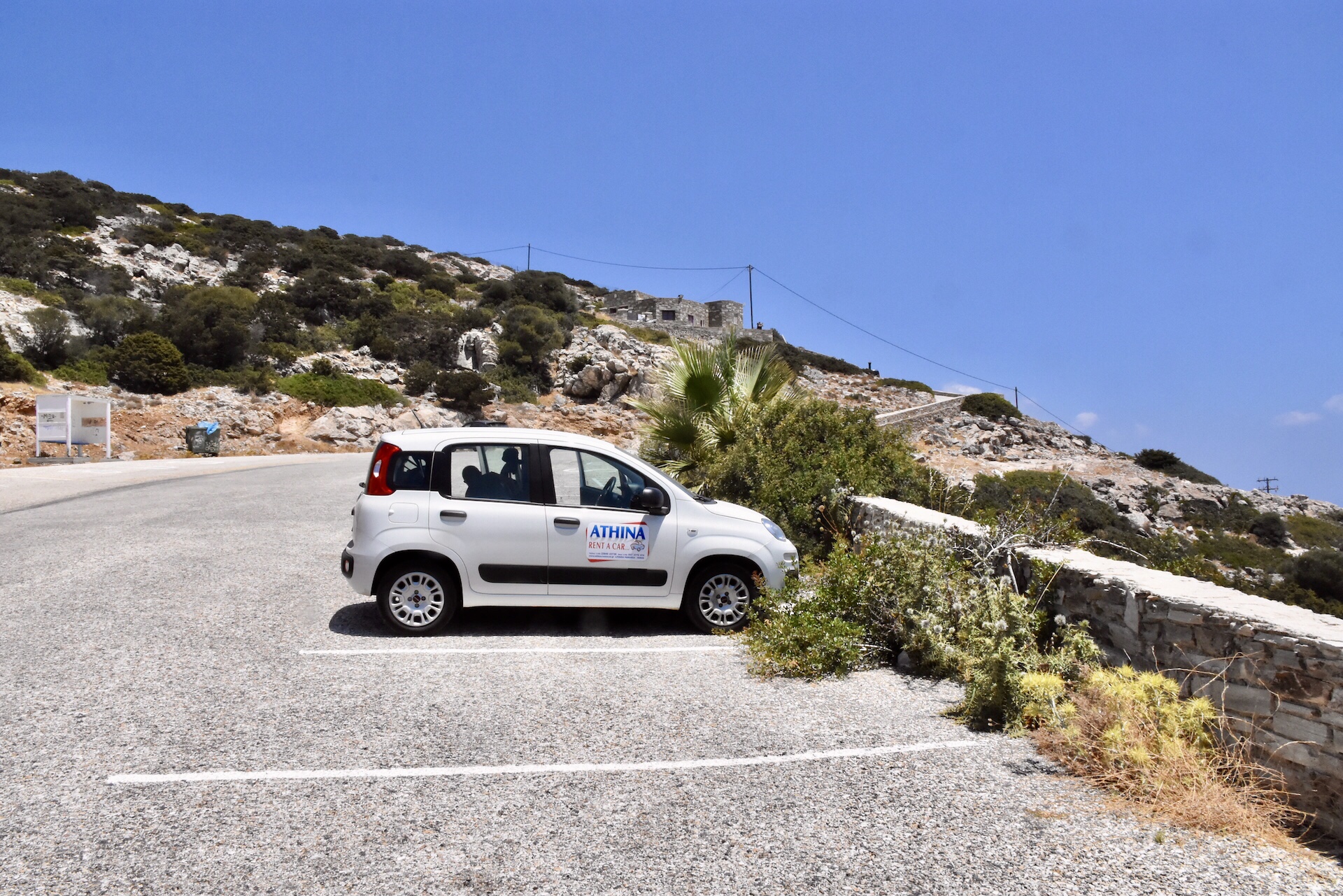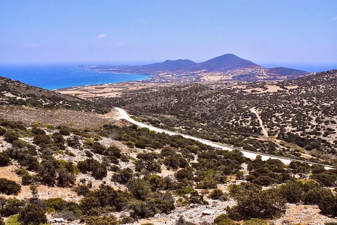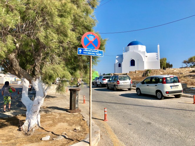Als sich Mika lange genug im Sandburgenbau geübt hatte, fuhren wir weiter zur Höhle. Die einsame, aber sehr gut ausgebaute, Straße führte uns den Berg hinauf zu einem großen leeren Parkplatz. Anhand der Markierungen waren hier normalerweise eine Menge Reisebusse anzutreffen. Heute jedoch waren wir allein hier, weshalb wir davon ausgingen, dass die Höhle geschlossen sei. Um uns zu überzeugen hätten wir noch einen kleinen Fußmarsch zum Eingang unternehmen müssen, aber wir hatten keine Lust. Stattdessen bestaunten wir die gute Aussicht von oben auf die Südspitze von Antiparos.