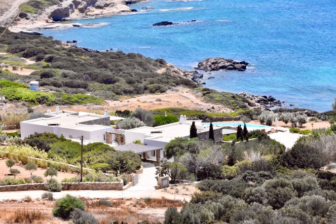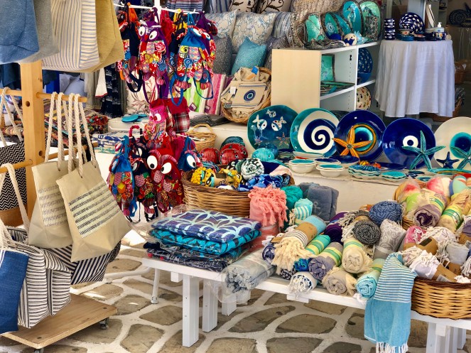 Zurück im Tal fuhren wir weiter bis ins kleine Hippie-Dörfchen Agios Georgios ganz im Süden. Keine Ahnung, ob hier wirklich welche leben, zumal am Ortseingang eine pompöse Villa die nächste jagte, aber da, wo wir dann schließlich einkehrten, war die Straße zu Ende und die 2-3 Restaurants und Café’s versprühten Hippie-Feeling satt. Einkaufsmöglichkeiten habe ich überhaupt keine gesehen und ich vermute, dass es hier lediglich ein paar Villen der Reichen und zu vermietende Ferienhäuser und Apartments gibt. Auf jeden Fall kann man hier scheinbar wunderbar Seafood essen und Ausflüge per Boot auf die umliegenden kleineren Inseln unternehmen.