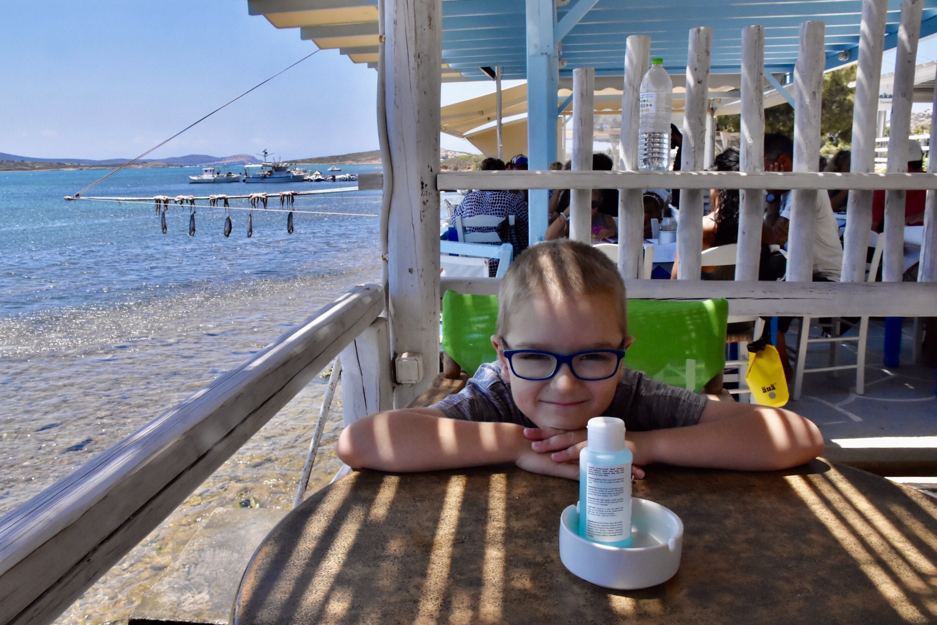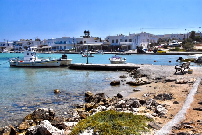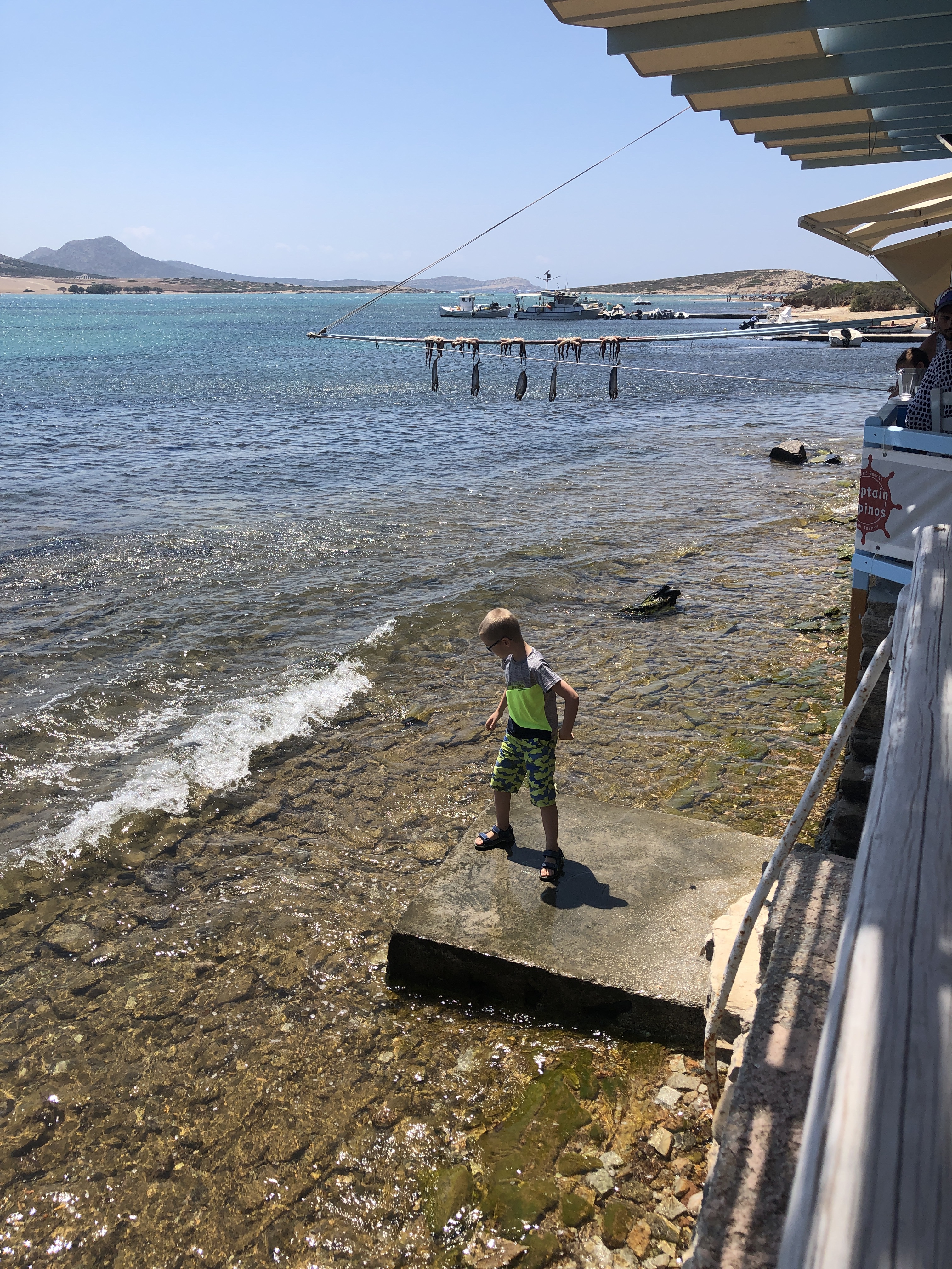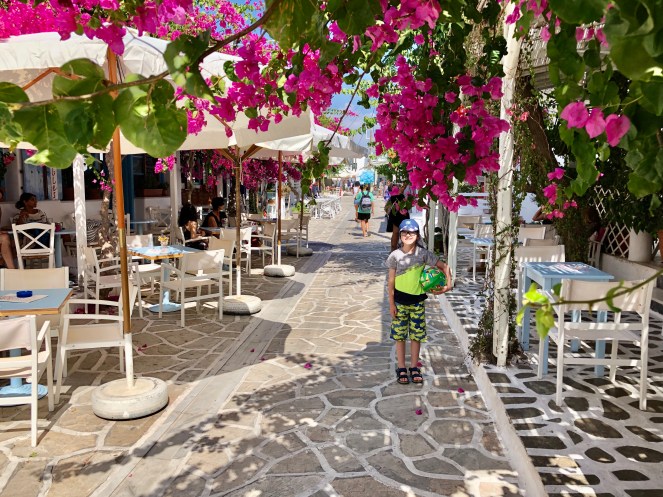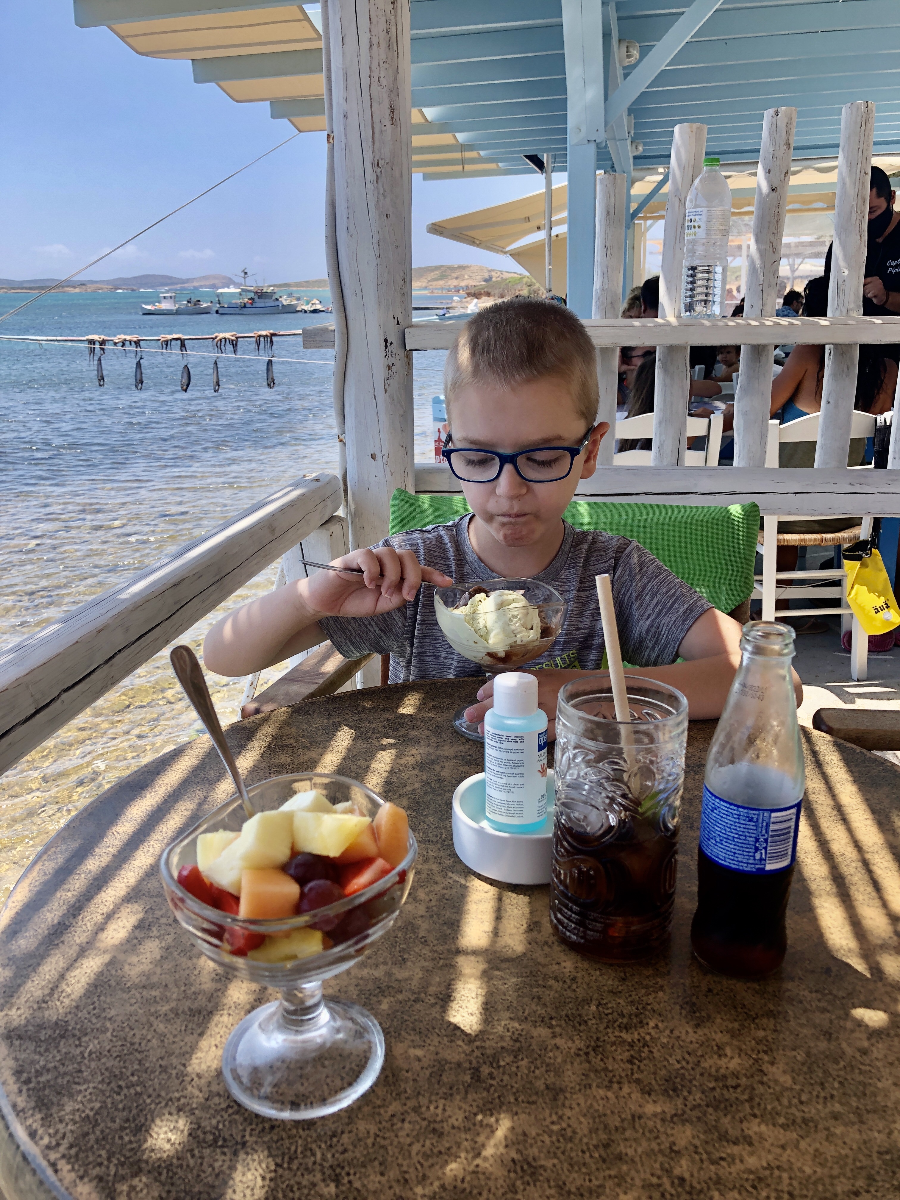 Das Despotiko Café – den Namen hat es wohl der gegenüberliegenden gleichnamigen Insel zu verdanken – war total einladend und bot eine unglaubliche Aussicht auf das Meer, die Fischerboote und die archäologische Stätte am Ufer von Despotiko. Ich bestellte mir einen wirklich leckeren Obstbecher und Mika bekam eine wilde Mischung aus Cola und Schoko-Vanille-Eisbecher. Das Restaurant nebenan, Captain Pipinos Seafood Taverna, war im Gegensatz zu unserem rappelvoll. Aber da wir keine richtige Mahlzeit zu uns nehmen wollten, waren wir mit unserem Café gut bedient. Die Speisekarte war dennoch überwältigend vielfältig.