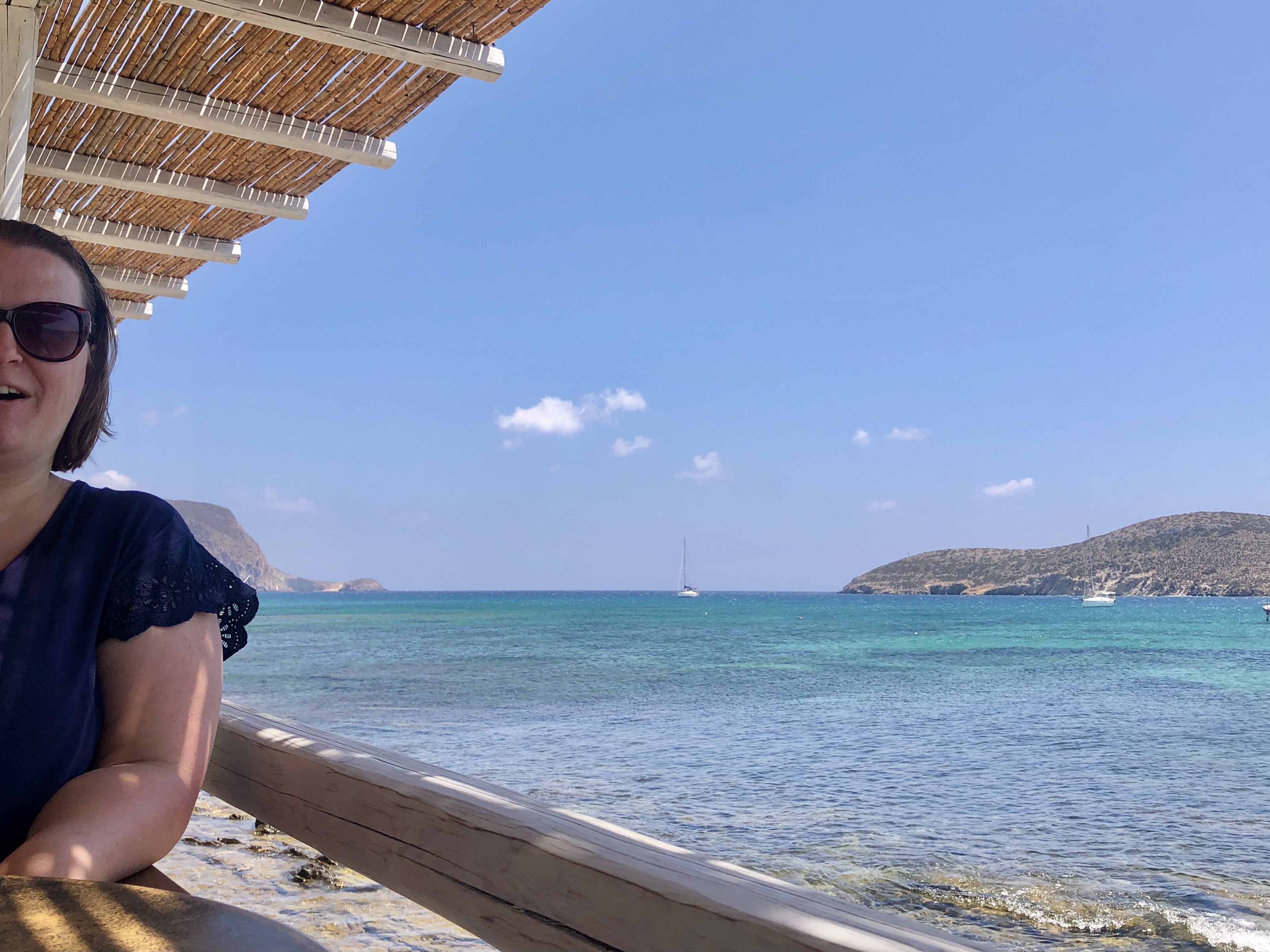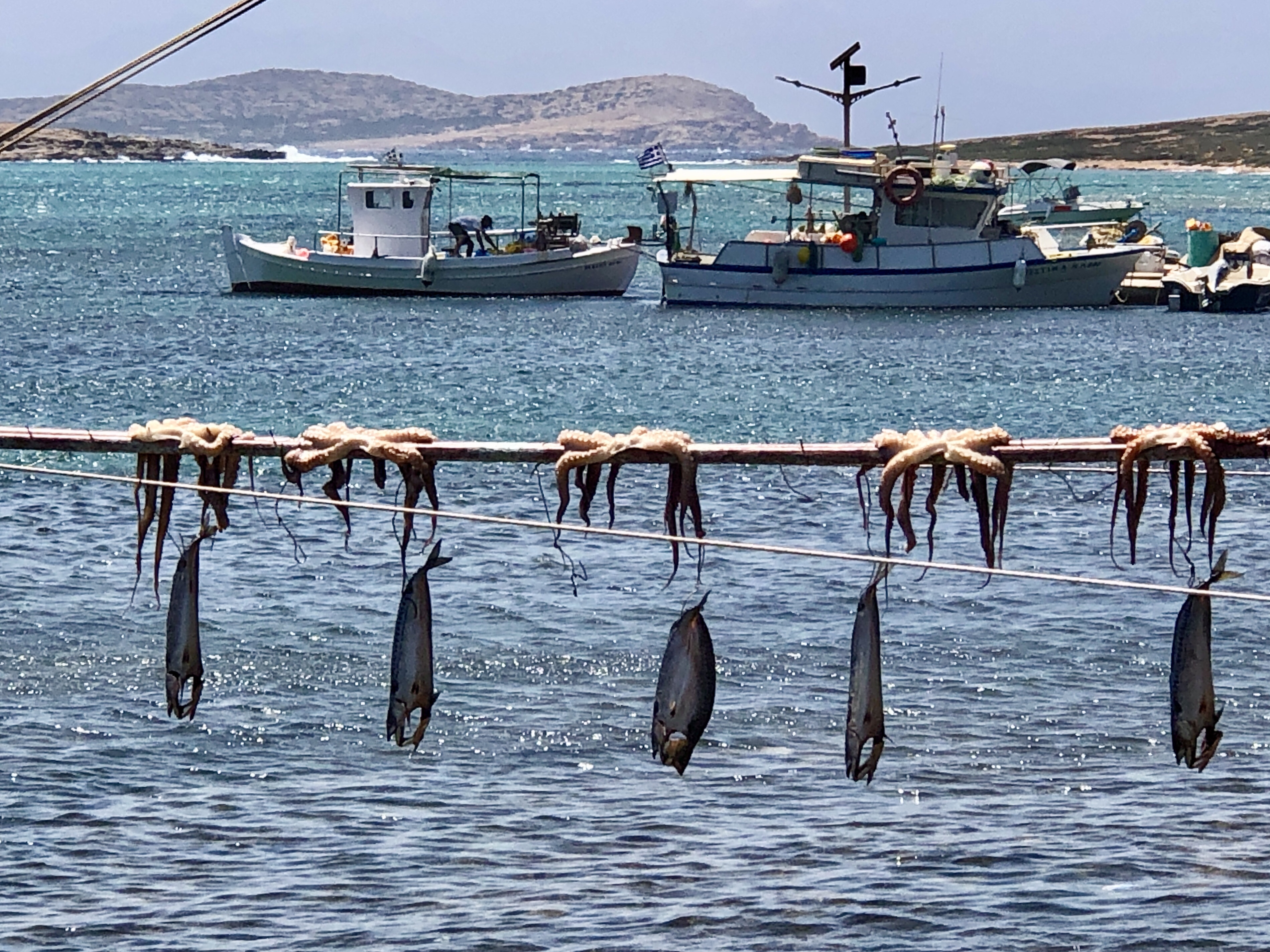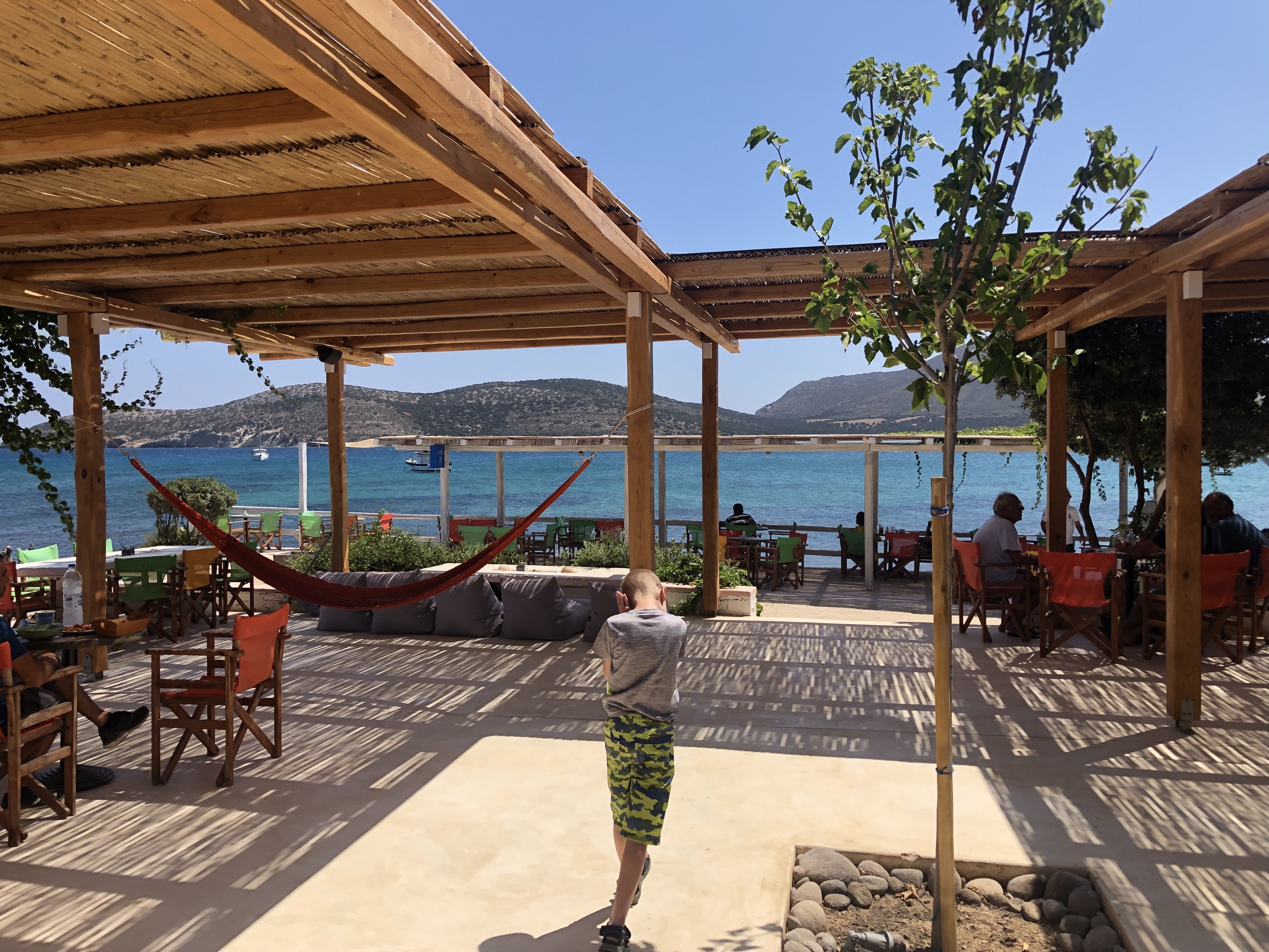 Das Despotiko Café – den Namen hat es wohl der gegenüberliegenden gleichnamigen Insel zu verdanken – war total einladend und bot eine unglaubliche Aussicht auf das Meer, die Fischerboote und die archäologische Stätte am Ufer von Despotiko. Ich bestellte mir einen wirklich leckeren Obstbecher und Mika bekam eine wilde Mischung aus Cola und Schoko-Vanille-Eisbecher. Das Restaurant nebenan, Captain Pipinos Seafood Taverna, war im Gegensatz zu unserem rappelvoll. Aber da wir keine richtige Mahlzeit zu uns nehmen wollten, waren wir mit unserem Café gut bedient. Die Speisekarte war dennoch überwältigend vielfältig.
