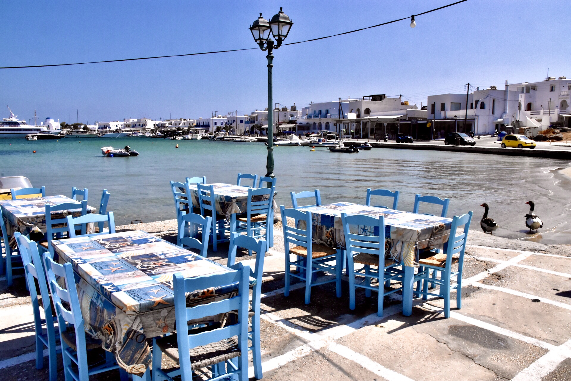 Gegen 15 Uhr erreichten wir den Hauptort und schlenderten an der Hafenpromenade entlang. Diese kleine gefiederte Familie erregte unsere Aufmerksamkeit. Süß, oder? Überhaupt der ganze Ort war total knuffig. Wieder so ganz typisch griechisch, wie ich es mir vorgestellt hatte. Nur irgendwie war wieder niemand außer uns zu sehen. Etwas spooky war das schon. Ich gehe aber mal davon aus, dass es daran lag, dass es erst Nachmittag war und die Griechen erst abends Essen gehen. Die touristischen Tagesausflügler, für die diese hübschen Restaurants wahrscheinlich gedacht sind, bleiben aktuelle scheinbar weiterhin aus. Für diese Branche war die Pandemie einfach eine riesengroße Katastrophe. Für die hiesige Natur und Inselwelt allerdings das Gegenteil. Ein zweischneidiges Schwert.