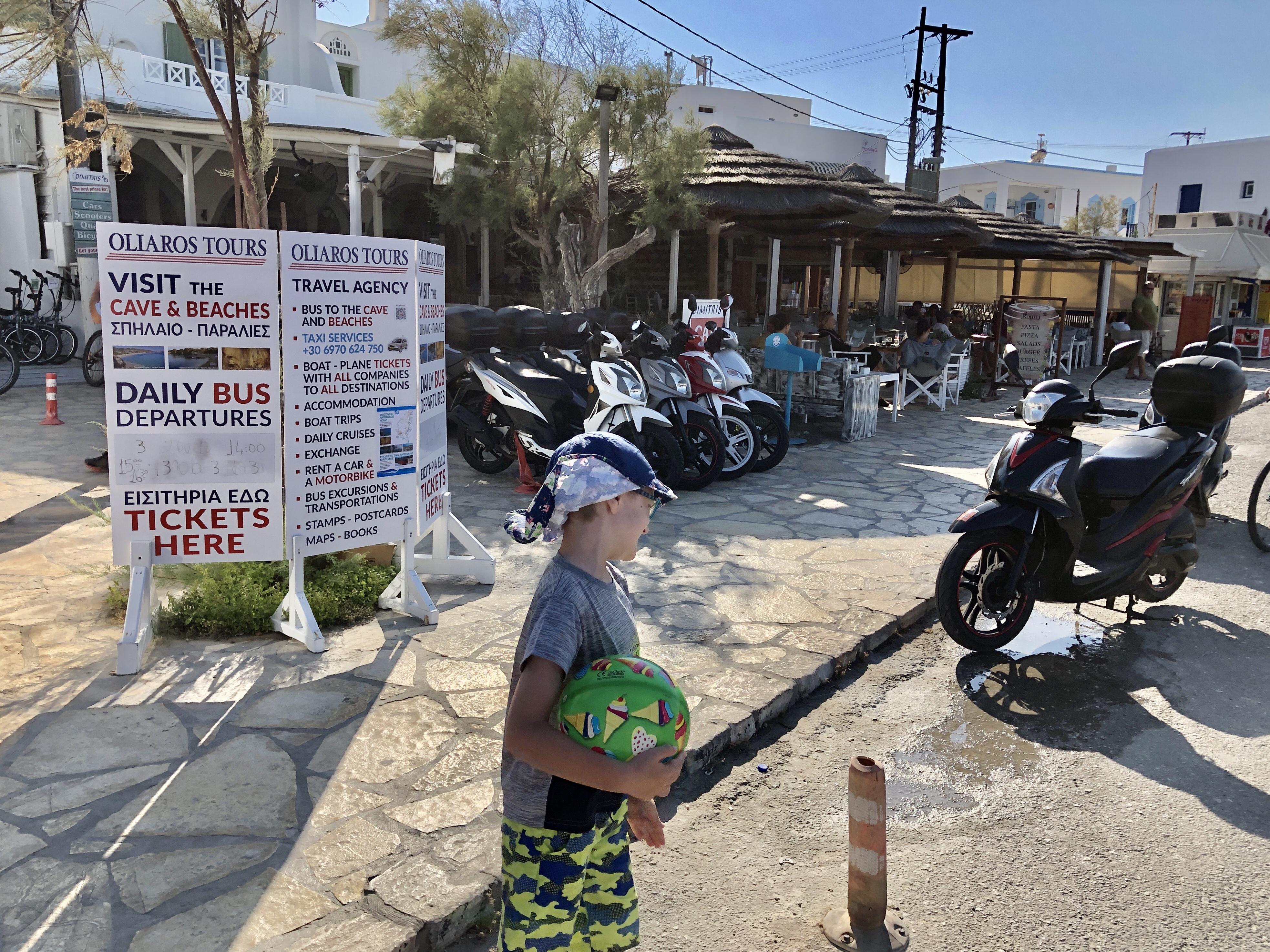 Wir suchten uns ein gemütliches Restaurant in der Nähe des Fähranlegers und bestellten uns einen Wrap, den wir uns teilten. Bei der Hitze hat man einfach mehr Durst als Hunger. Der Wrap war wieder super lecker. Ich muss zugeben, dass ich die Dinger vorher nie gemocht habe. Aber in diesem Urlaub bin ich ein echter Fan geworden. Im Kiosk um die Ecke erwarb Mika dann auch noch stolz einen Ball, den er ganz allein gekauft hat. Nach anfänglicher Schüchternheit, hat er es dann aber doch ganz gut gemeistert.